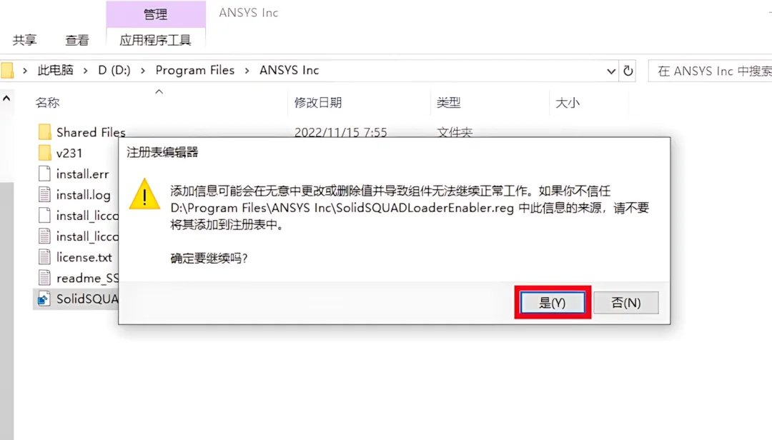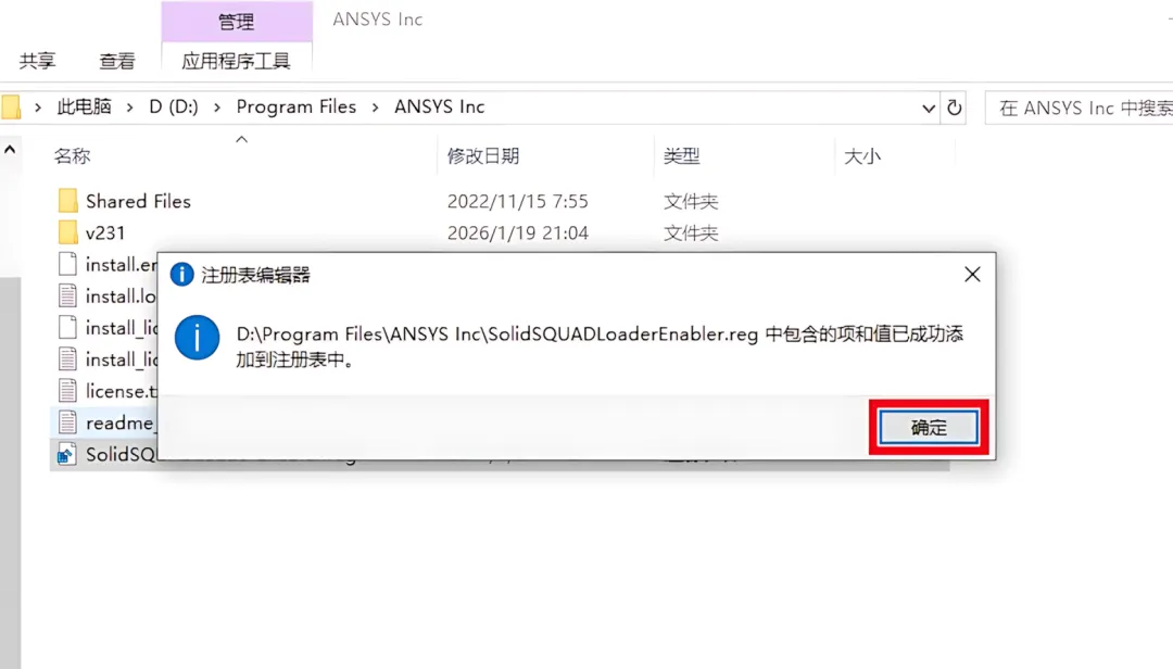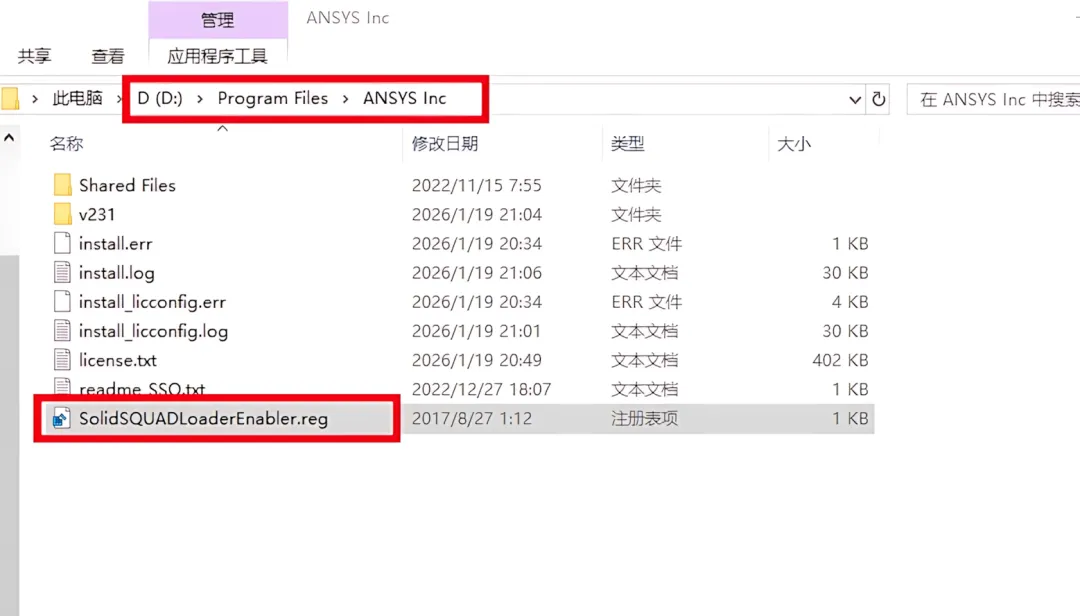 36.打开安装位置路径:D:\Program Files\ANSYS Inc(若您在步骤7修改了其它磁盘,请打开对应的磁盘路径),双击打开【SolidSQUADLoaderEnabler】。