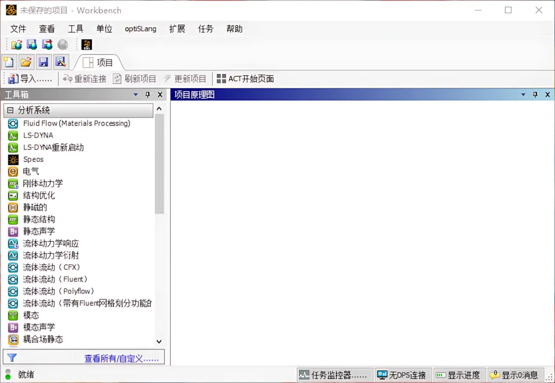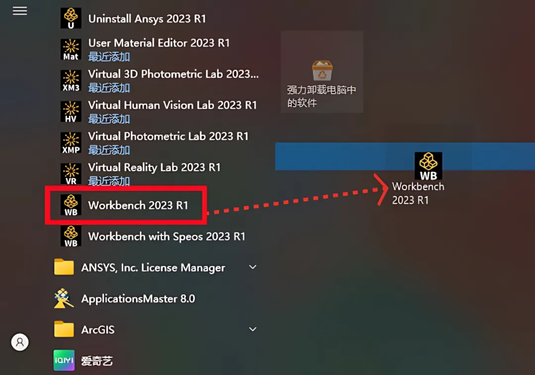 43.点击桌面任务栏中的【开始图标】,在所有应用中-点击【Ansys 2023 R1】文件夹-点击【workbench 2023R1】启动软件(您也可以选择启动ANSYS其它产品,如:APDL、Fluent、CFD等)。