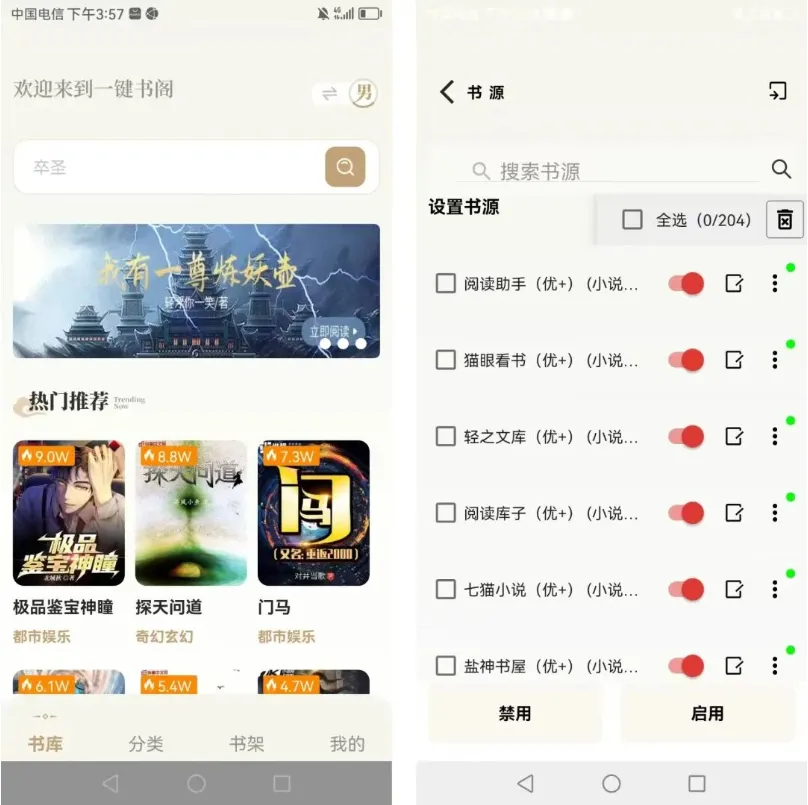 这款是比较新的免费小说神器,无需要登录注册,打开直接使用,软件内置204条书源,不用你再手动导入,非常良心
