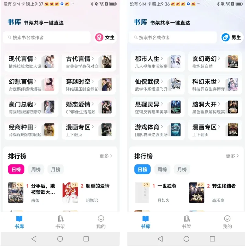 这里介绍的是其中某个版本,打开首页,可以一键切换女生和男生两个频道,男频分类:玄幻、仙侠、悬疑、灵异等等,女频分类:言情、穿越、爱情、总裁等等,基本想要的类型都能找到