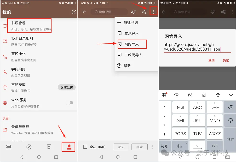 软件安装后,点击右下角的【我的】图标 -> 点击【书源管理】 -> 点击右上角的三个点 -> 点击【网络导入】,复制小风提 供给大家的书源地址 -> 点击【确定】