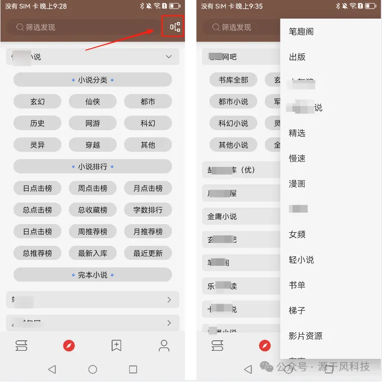 点击右上角的按钮,可以根据你的喜好,快速切换分类,有精选、女频、男频、轻小说等等,甚至还能看到有一些漫画资源