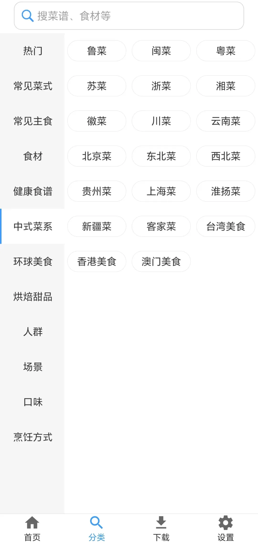 常见的包括川菜、浙菜、湘菜、粤菜等等几十种菜系,凉菜、素菜、小吃等各种菜式详细的做法,配以文字和图片形式尽情展现,即使小白也能轻松学会。