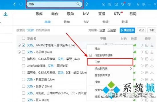 2.在搜索框内输入要下载的歌曲,跳出相关歌曲后右击下载;