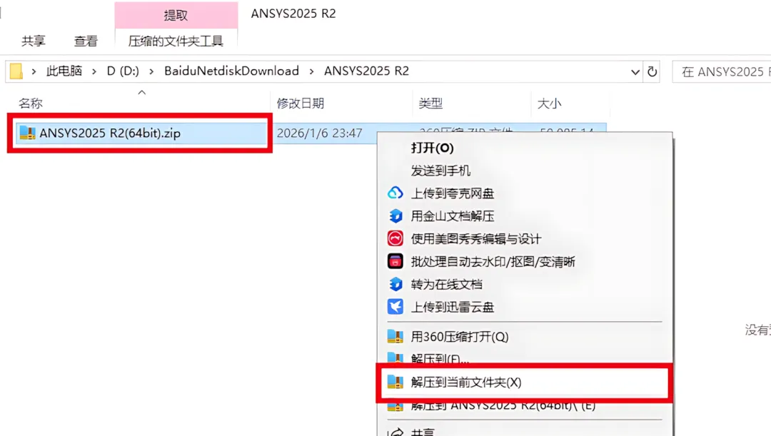1.下载ANSYS2025.R2软件安装包到电脑上,右键选择【解压到当前文件夹】。