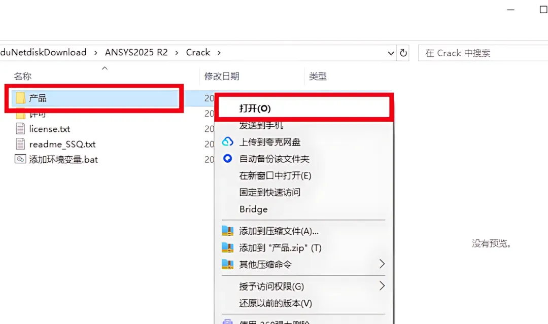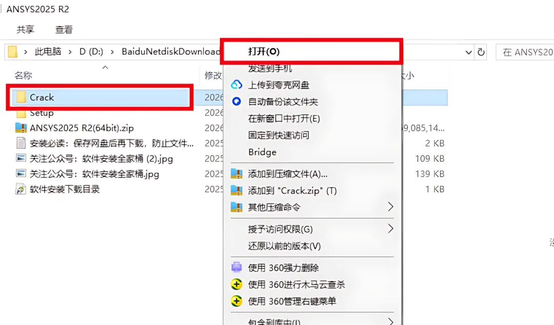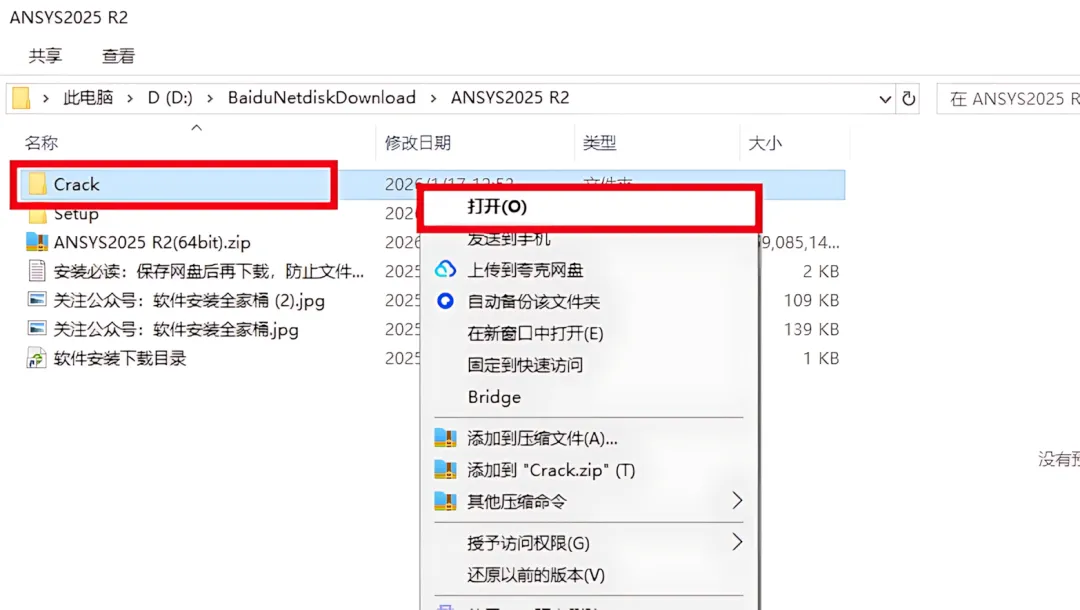 14.打开安装包解压后的【ANSYS2025 R2(64bit)】文件夹,双击或右击打开【Crack】文件夹。