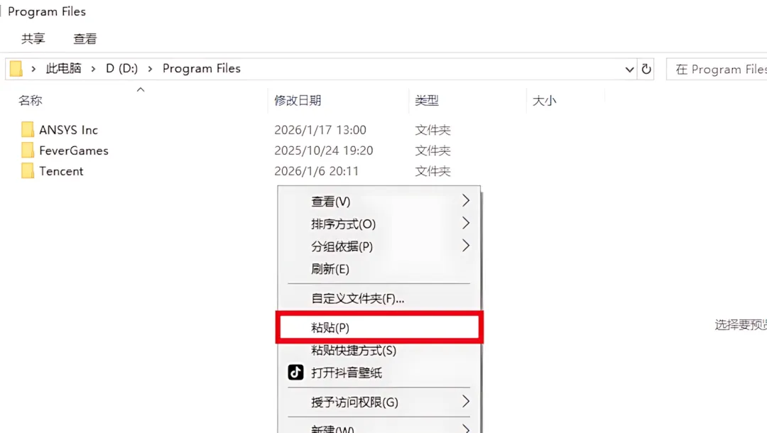 17.打开许可安装路径【D:\Program Files】(如您在步骤8修改为其他位置,选择对应位置打开),鼠标右击空白处选择【粘贴】。