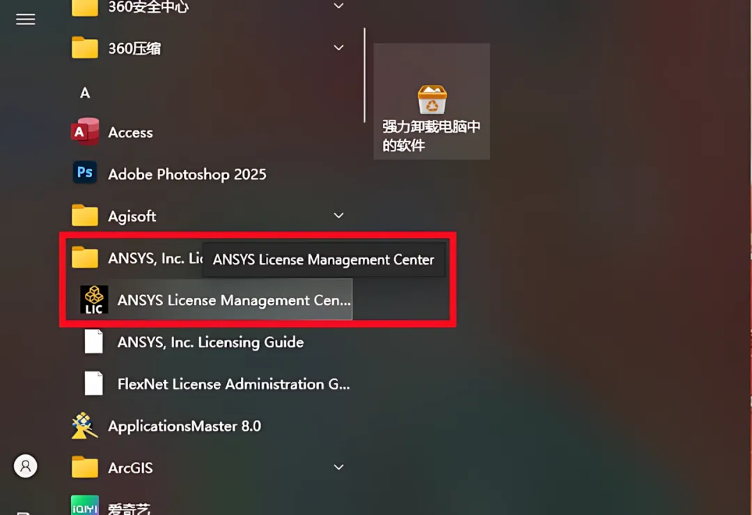 19.点击桌面任务栏中的【开始图标】>点击【所有应用】>双击展开【ANSYS,Inc……】文件夹,点击【ANSYS License Manager Center】。