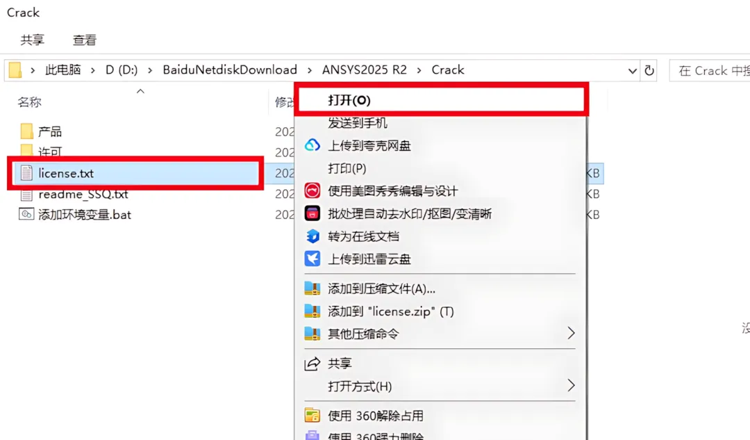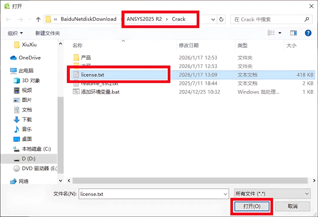 26.选择安装包解压后的【ANSYS2025 R2(64bit)】文件夹中【Crack】文件夹下的【license】,点击【打开】。