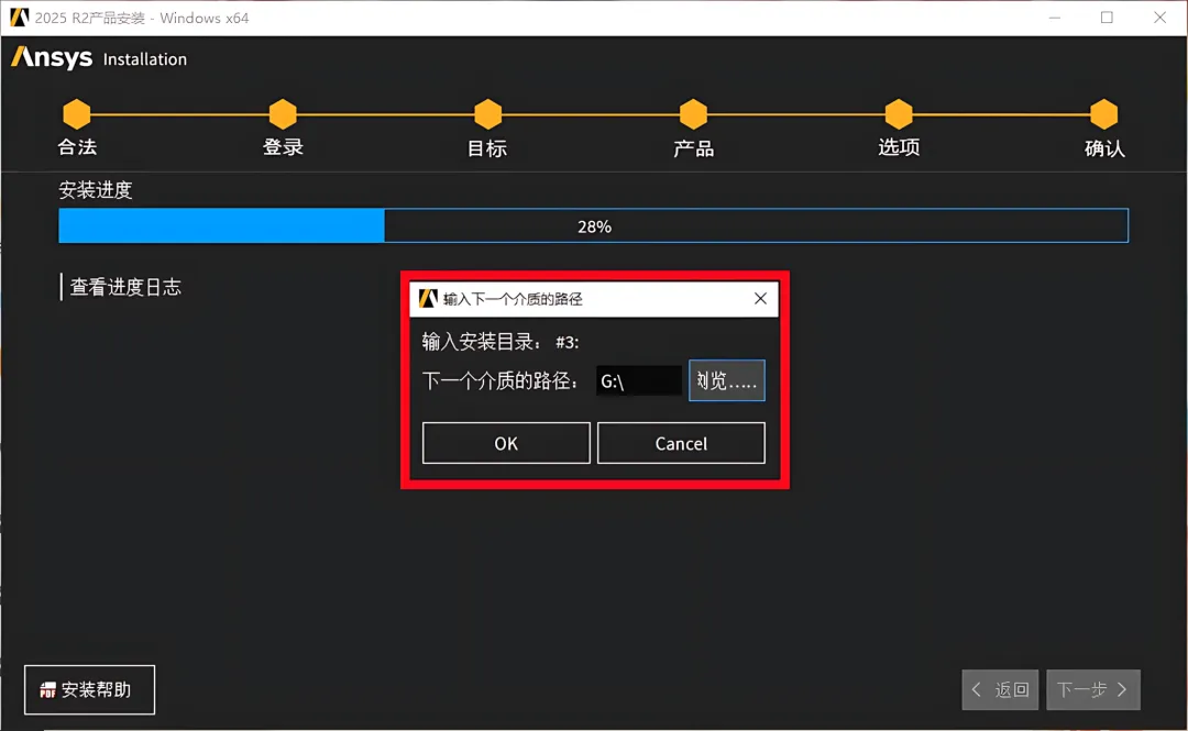 54.当安装进度到28%时,点击【浏览..】。选择步骤48装载的磁盘(如:G),点击【选择文件夹】。点击【OK】。