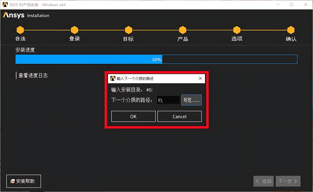 56.当安装进度到50%时,点击【浏览..】。选择步骤50装载的磁盘(如:I),点击【选择文件夹】。点击【OK】。