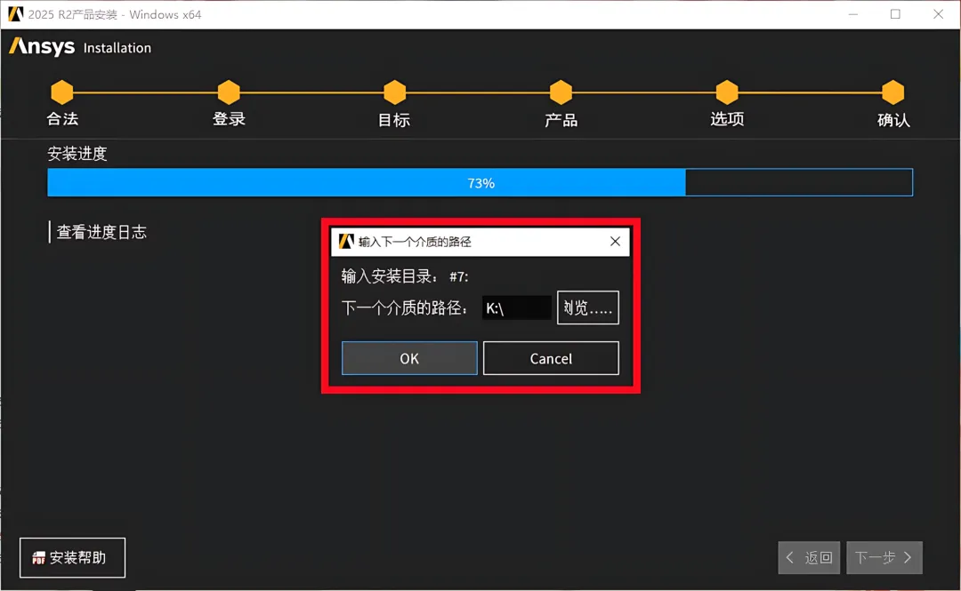 58.当安装进度到73%时,点击【浏览..】。选择步骤52装载的磁盘(如:K),点击【选择文件夹】。点击【OK】。