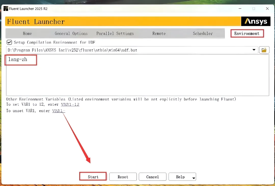 Fluent中文界面启动步骤:①先点击【Enviroment】输入②【lang=zh】③点击【Start】。