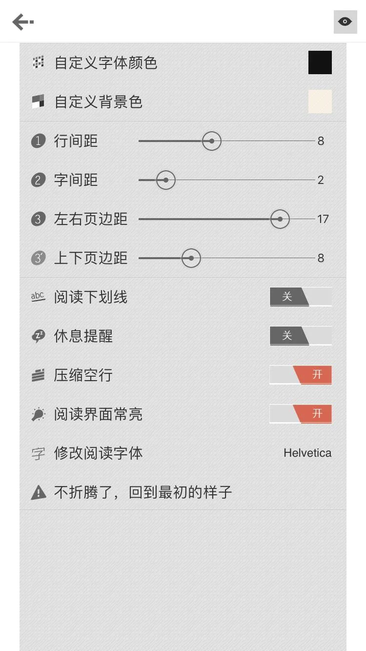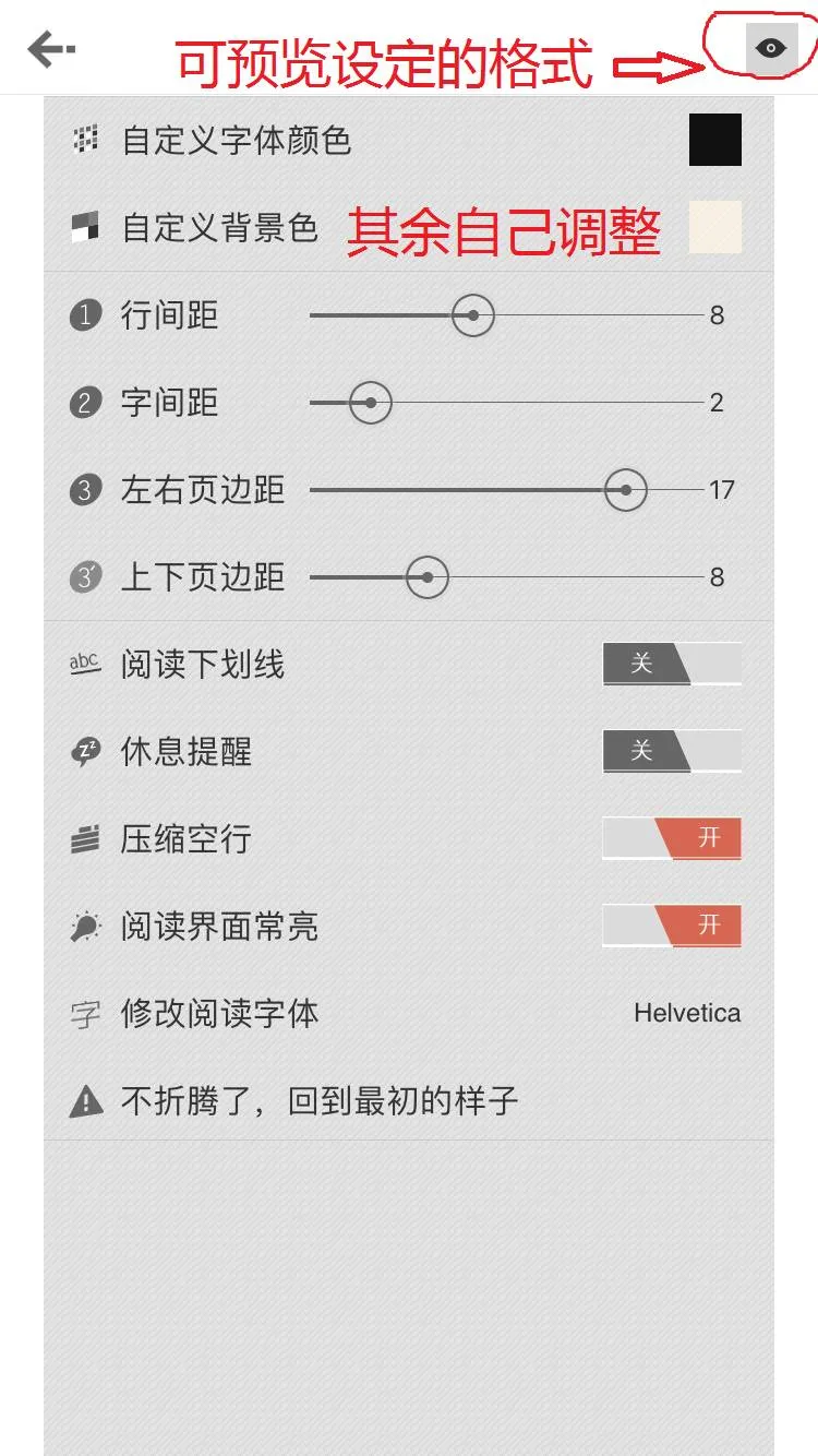 打开小说,点击最右下角的“。。。”,然后按照自己的习惯进行调整,打开后的最右上角有个眼,点击那个就可以看到你设定的样式预览。