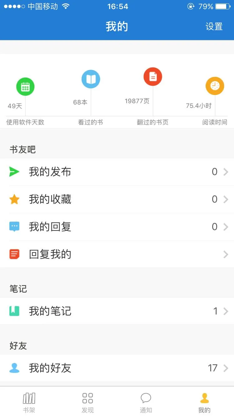 7.内有A盘(类似百度云,但只能自己上传下载)、书友吧、笔记广场、可加好友(可查看对方的看书时间、页数、本数、使用天数、发布的话题和笔记)