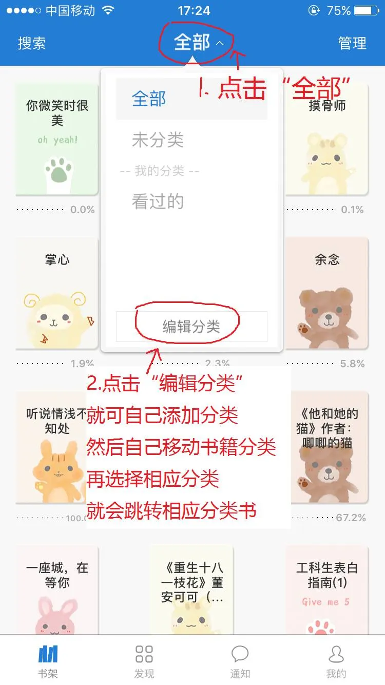 当然你要移动的话先在“分类管理”那里添加分类哦!按照自己想法添加分类,比如“看过的”“很好看的”“娱乐圈文”。分类移动完后,可以在书架上面选择想要的“分类”,就会显示那分类的小说哦!