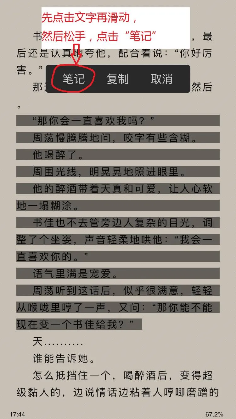 打开小说后,点击你想要的那段话后滑动,松手后再点“笔记”,就可以在这段话上面做笔记,可选择要不要分享到“笔记广场”。