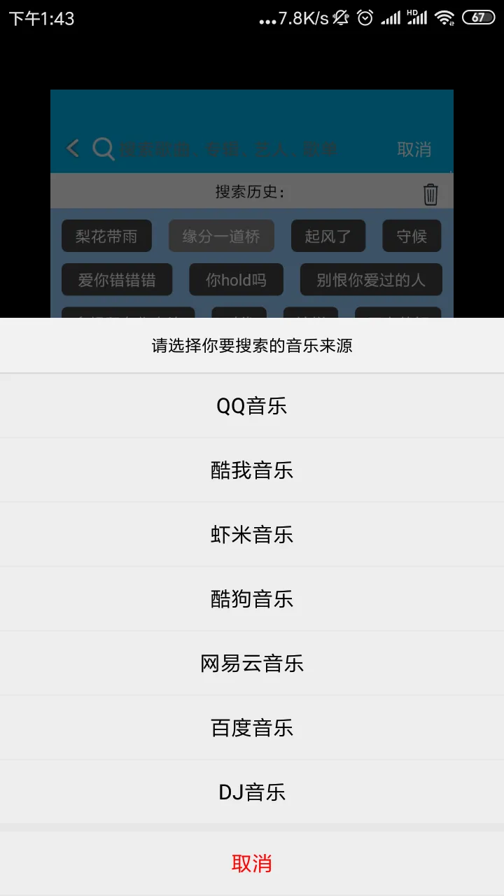 下面这张图就是我们输入完歌曲名称后弹出的“选择搜索的音乐来源”,我们可以根据我们的喜爱的音乐平台习惯去选择