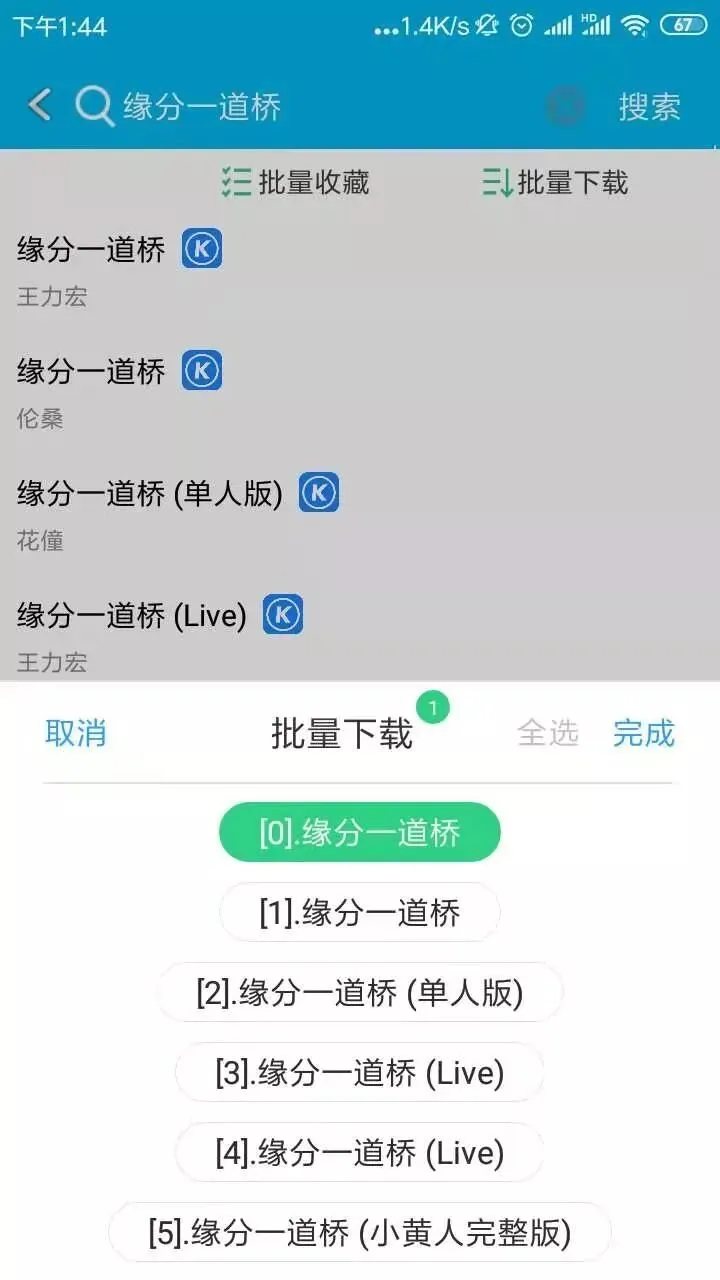 选择好“搜索音乐来源”后,我们进入到这个搜索结果页面,在下面的搜索结果页面我们可以看到在同一个音乐平台上会有很多歌曲列表,我们选择“批量下载”或者“批量收藏”,我们选择“批量下载”的时候,会弹出来一个界面,这个界面是我们要选择下载的歌曲,但是请注意选择这个的时候请与上方的歌曲列表的顺序要一致,否则我们选择的就不是我们想要下载的歌曲,选择好以后,我们点击“完成”它就添加到下载任务了,这个时候我们返回主界面,等几分钟我们打开主界面的“下载歌曲”,我们就能看到我们下载的歌曲了