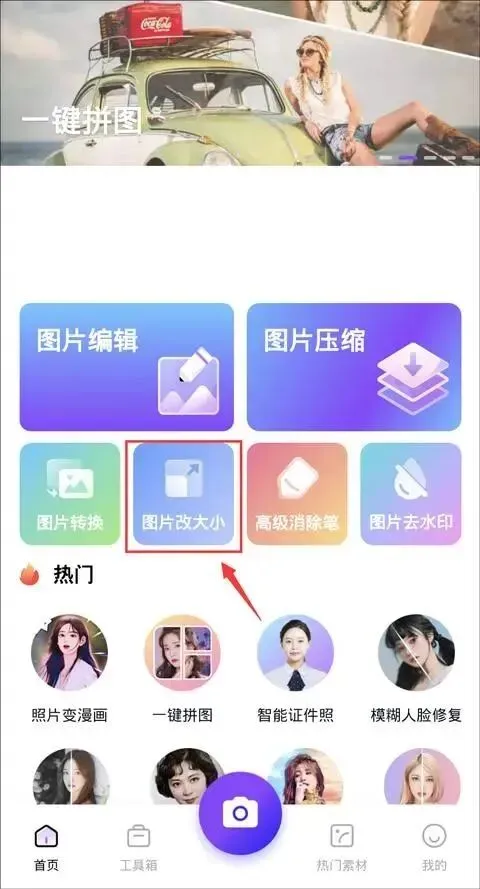 在首页点击选择“图片改大小”功能,支持多图批量导入操作,在页面下方的“等比修改宽高”中,进行数值的调整,完成设置点击“开始修改”,等待系统完成,自动保存在手机中。