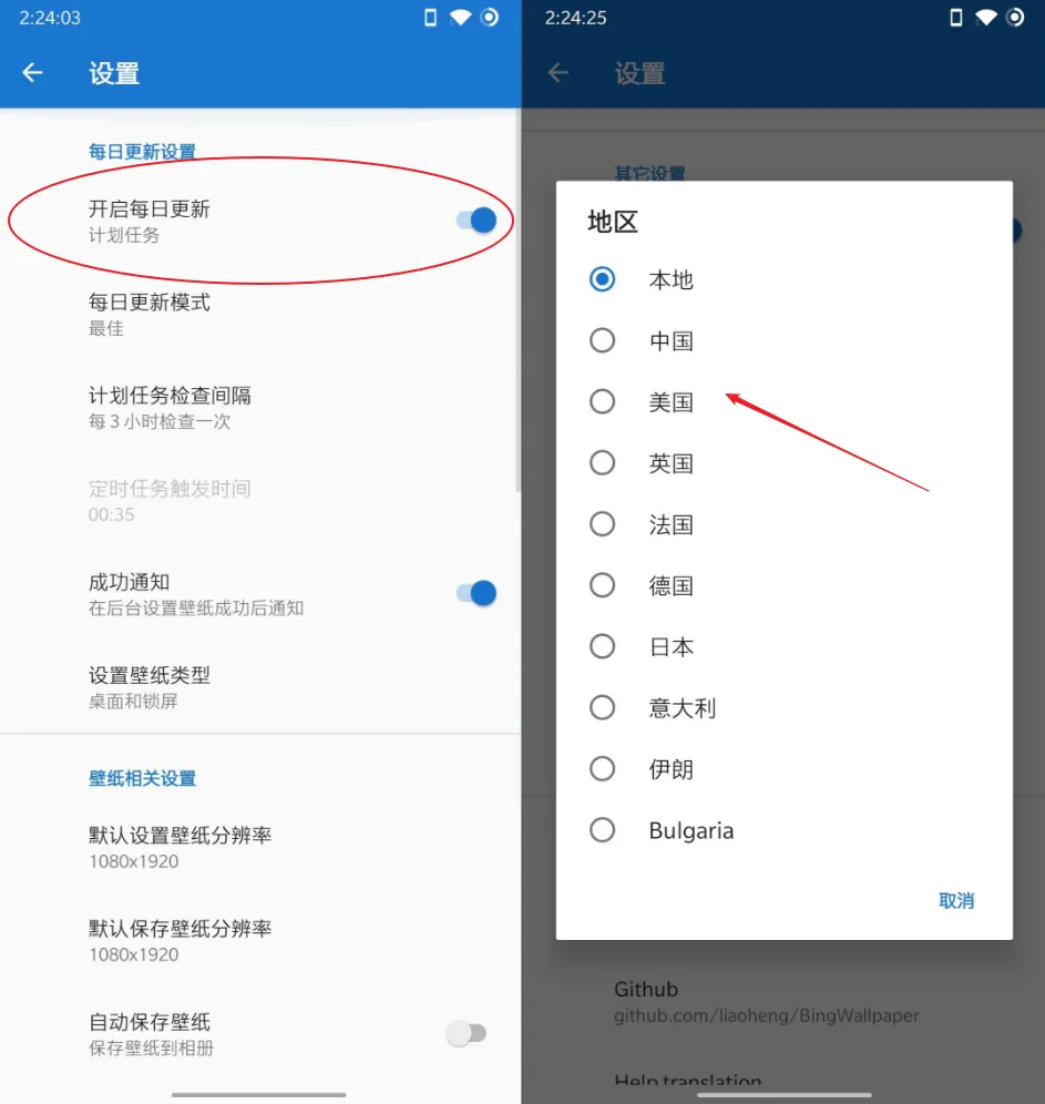你可以在设置里勾选「开启每日更新」,这样它就可以每天自动获取最新的必应壁纸并帮你更换手机壁纸。
