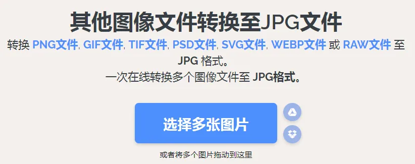 iLoveIMG支持将JPG文件转换至PNG文件或GIF文件,也支持将其他文件TIFF文件、PNG文件、GIF文件或RAW图像文件转换至JPG文件。