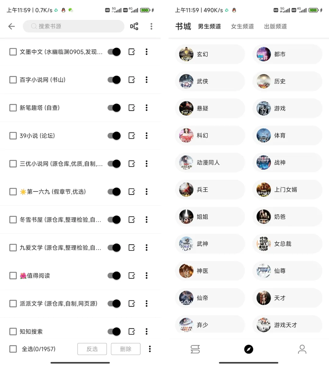 小说软件自带1957的书源,用来搜一些小说看,如果加载不了的话,点击换源,总能找到几个合适的书源来看小说