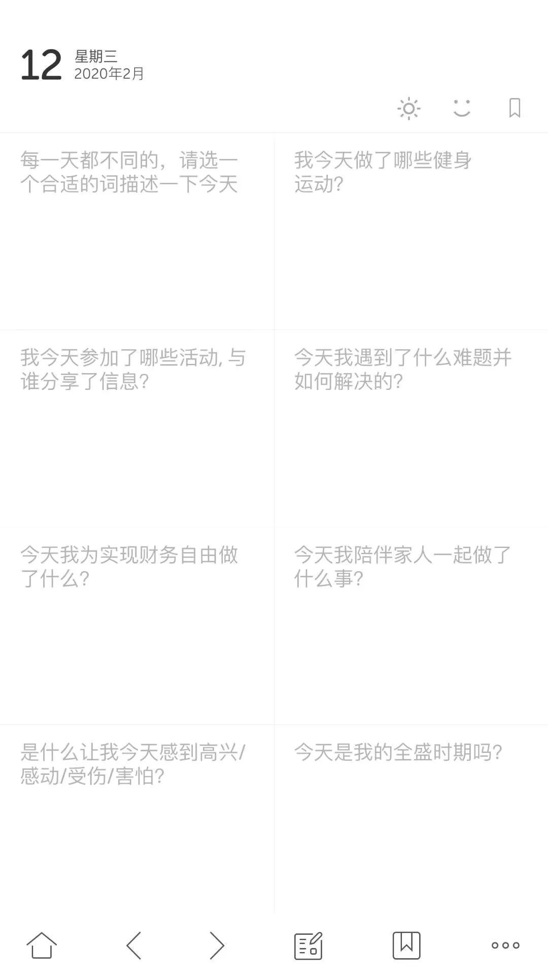 从名字就可以看出来,格志日记是用格子记录的,每一个格子有不同的主题。因为对于一些刚开始想培养写日记习惯的人来说,面对一张白纸会有一些茫然,而这款app预制了很多问题模版,采用问答的形式,特别方便,比如“今天我吃了什么食物”“是什么让我今天感到高兴 ”“今天谁的行为感动了我”……当形成了习惯有了自己的思路之后,就可以自定义属于自己的问题模版啦~