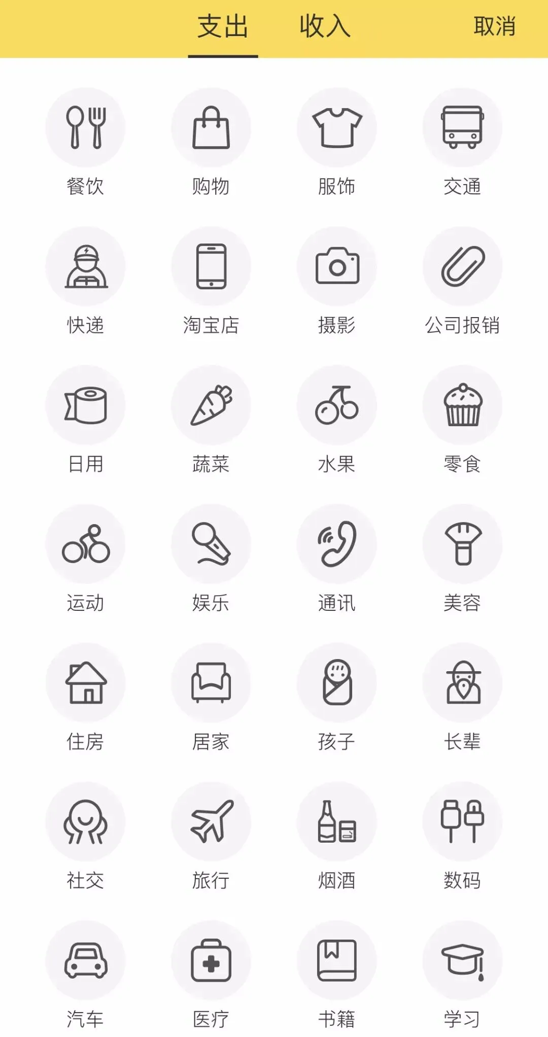 app的界面设计和配色都很极简 黄白色搭配 审美在线 体验感很好 支出类别区分很详细 如果找不到符合的 还可以自己添加 。