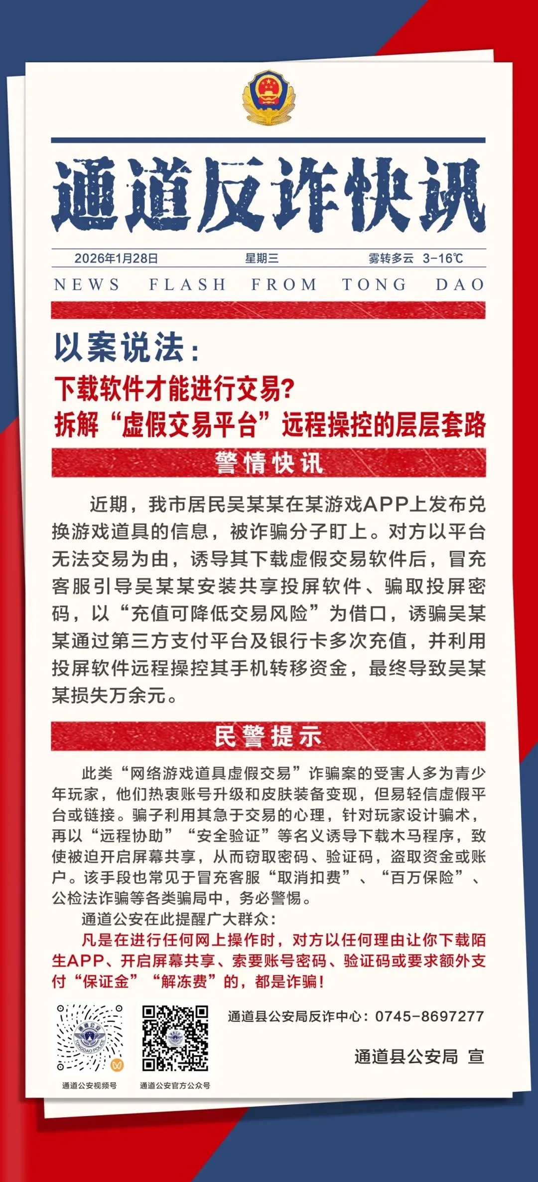 平安五溪·冬春攻势丨反诈快讯(二)下载软件才能进行交易?通道公安拆解“虚假交易平台”远程操控的层层套路 · END · 编辑:张羽格 马邱瞳 编审:杨 硕 审签:伍子猛 来源:刑事侦查大队、政工室 往期推荐: 平安五溪·冬春攻势丨打击违法犯罪纪实(二)“1小时”速度!从店外锁定到店内抓捕,通道公安闪电抓获一名在逃人员 平安五溪·冬春攻势丨《闪亮的名字》—2025“最美基层民警”发布仪式在通道公安引发热烈反响 平安五溪·冬春攻势丨反诈快讯(一)高额返利?实为骗局!通道公安揭秘“跨界电商”电诈案“双线”埋伏 平安五溪·冬春攻势丨队伍风采纪实(一)解锁核心战斗力!这期“通警讲堂”全是干货!