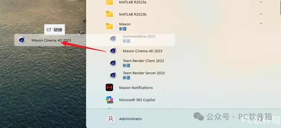 11.点击任务栏中的【开始图标】,在所有应用中打开【Maxon】文件夹并将【Maxon Cinema 4D 2023】拖到电脑桌面。