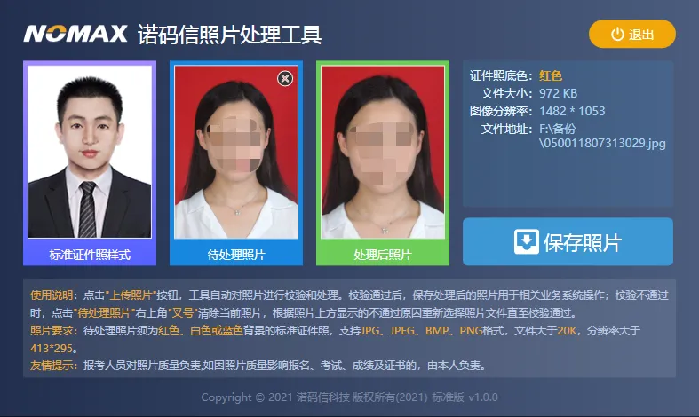 【诺码信照片处理工具】是一款小巧免费的证件照处理软件,它和普通的证件照处理软件功能不太一样,它可以帮用户在处理图像之前,对图片进行审核,审核通过后符合要求才能对照片进行下一步处理,而且这个工具也支持绝大多数的网站报名、考试、成绩证书等查询使用。