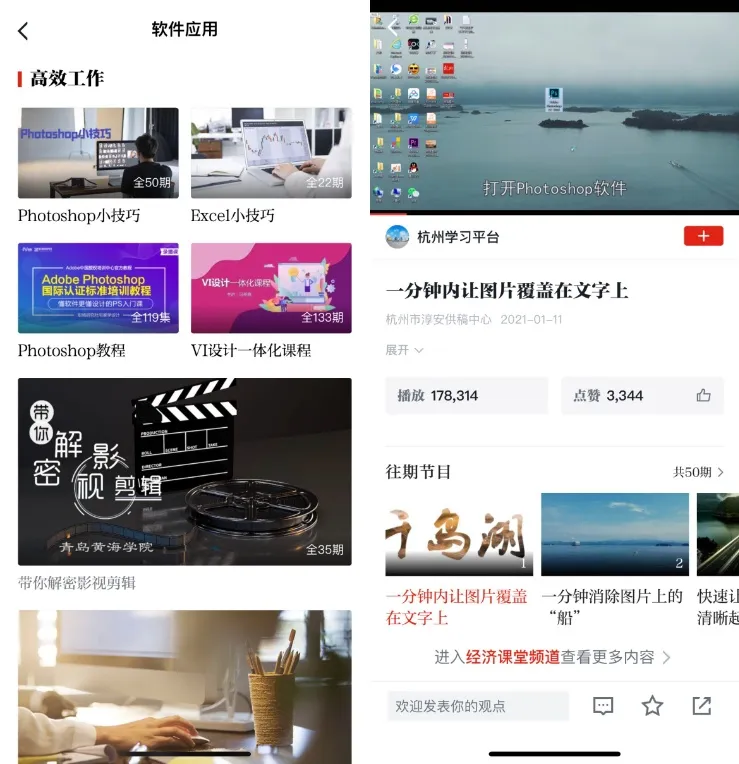 只需在 APP 上点击“职业课堂”-“软件应用”,就能免费观看 PS、PR、AE、Office、WPS 等各大软件入门和高级教程,以及各种使用小技巧。