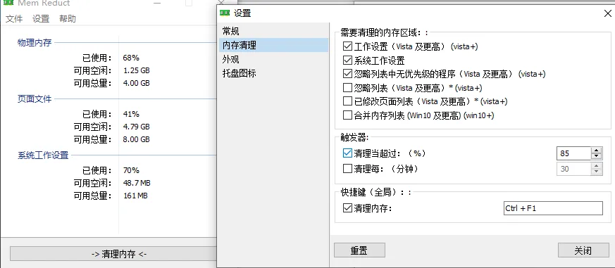 内存清理软件,内存释放,定时内存释放软件,可以设置内存超过多少自动清理,适用于各种缓存到内存的游戏或者软件。
