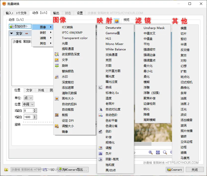 XnConvert是一个快速、强大且免费的跨平台批量图像转换器。它允许自动编辑您的照片集:您可以轻松地旋转、转换和压缩您的图像、照片和图片,并应用80 多种操作(如调整大小、加水印、裁剪、颜色调整、过滤器等)。支持所有常见的图片和图形格式。