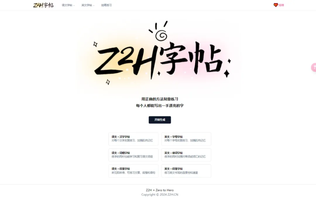 Zero to Hero是一个字帖生成网站,有语文、英文和控笔练习三个模块,适合各个年龄层。汉字字帖通过反复练习加强肌肉记忆,英文字帖构造相同,控笔练习字帖可以选择图案并设置描红参数,编辑好的字帖支持导出成图片文件。
