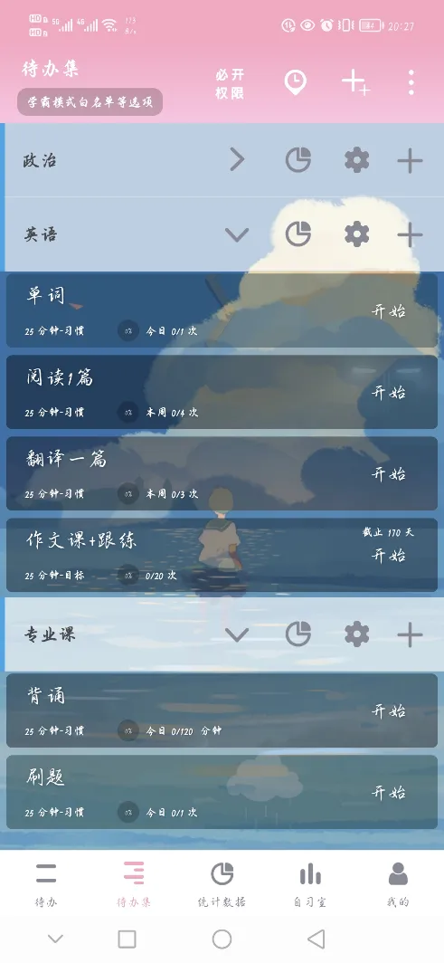 App 里还有强制锁机的“学霸模式”,一旦开始计时就会锁机,其它应用就开不了了(可以设置白名单),想玩手机都不能玩。除了开启任务计划进行锁机之外,还可以设置自定义时间段的锁机。它不仅支持某一项待办计划,还能够帮助你指定长期目标、习惯等,科学管理时间,强制克服拖延症。