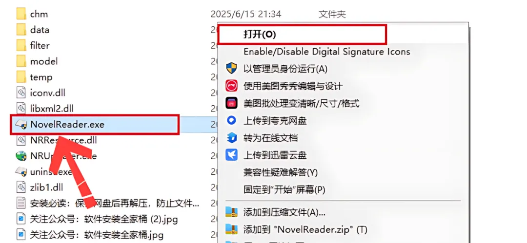 软件有绿色版也有安装版,今天给大家带来的是绿色版,无须安装,双击或右击“NovelReader.exe”即可打开软件。