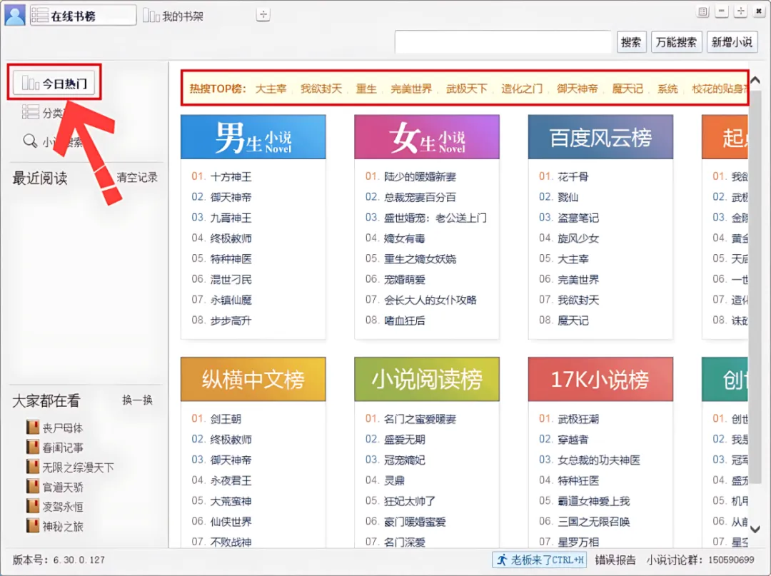 今日热门:点击榜单包括有热搜TOP榜、男榜、女榜、阅读榜等。