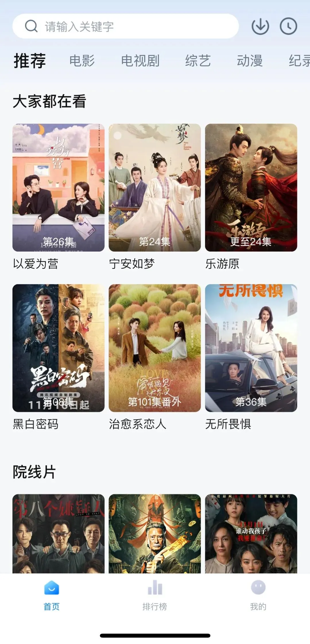 软件不用登录,打开就能直接用,打开后软件会将近期大家爱看的资源分成大家都在看,院线片,日韩,热播漫等给展示出来,想看什么直接点就行。