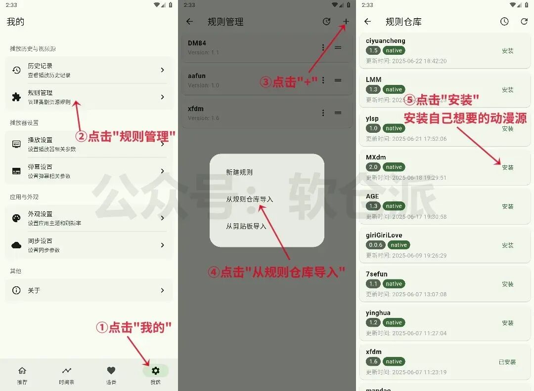 内置的动漫源只需要五步即可轻松添加,①点击”我的”,②点击“规则管理”,③点击右上角”+”,④点击”从规则仓库导入”,⑤点击”安装”,具体教程如下图: