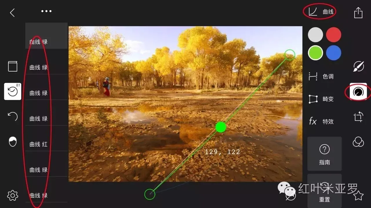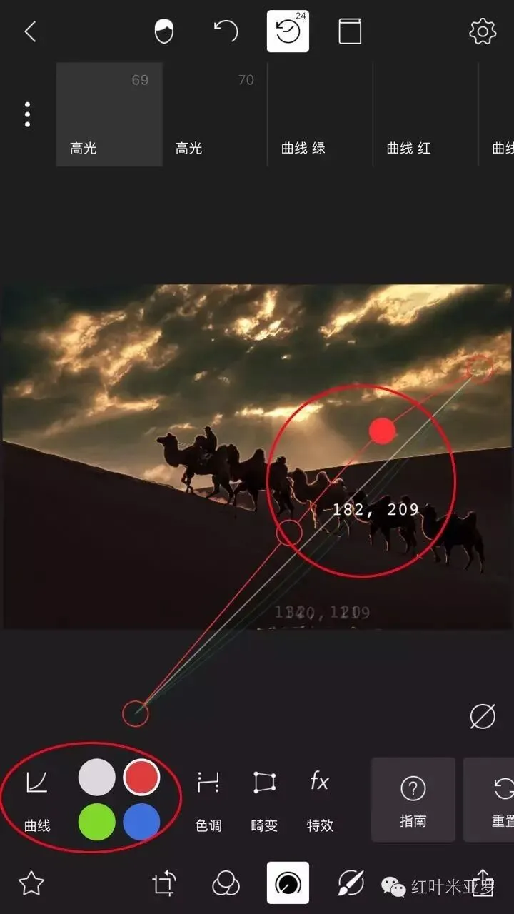 曲线调整:黄色由红色、绿色叠合而成,点中红色,上提红色曲线