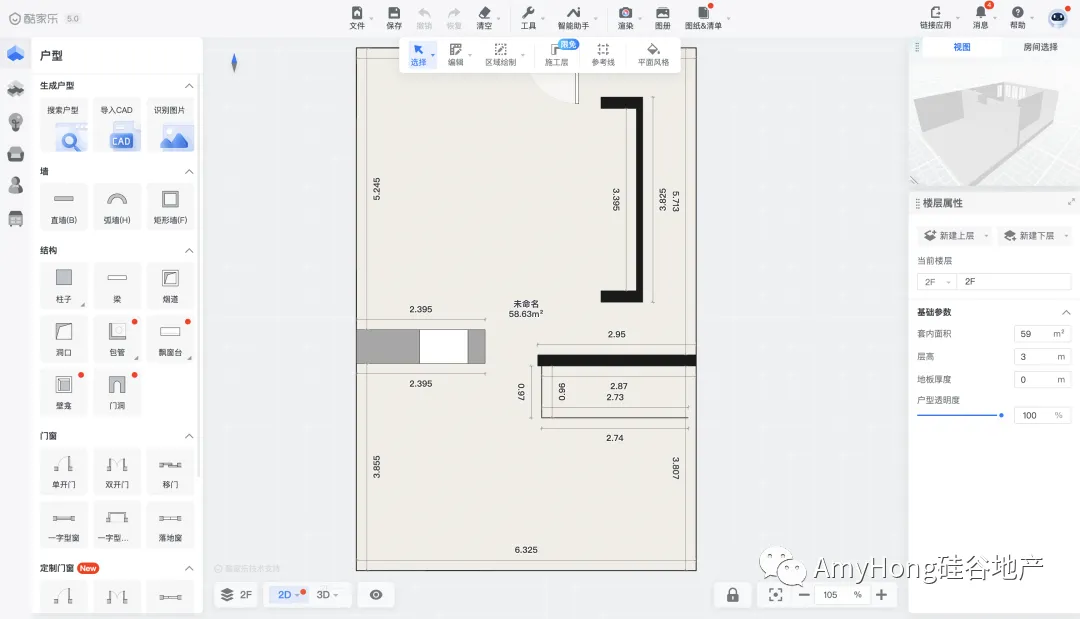 绘制户型图,可以导入CAD或者图片自动生成户型图,国内的小伙伴甚至可以用小区名称自动导入户型图,我没有图,第一次使用花了两个晚上测量家里的尺寸成功画出了户型图。