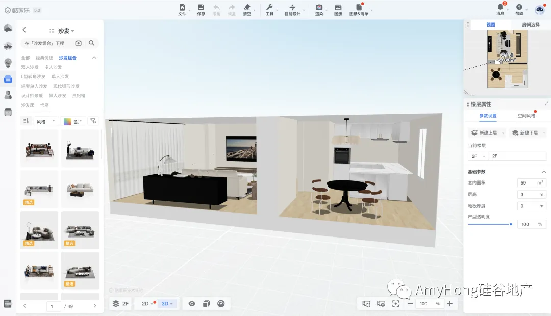 进入3D模式,从素材库里选择硬软装加进户型图里,从地板墙面、厨卫家电到陈设饰品,选择又多又全,更新频率也很快,而且尺寸颜色面料都可以更改,这一步就是不停地更换喜欢的家装家具,直到满意为止。