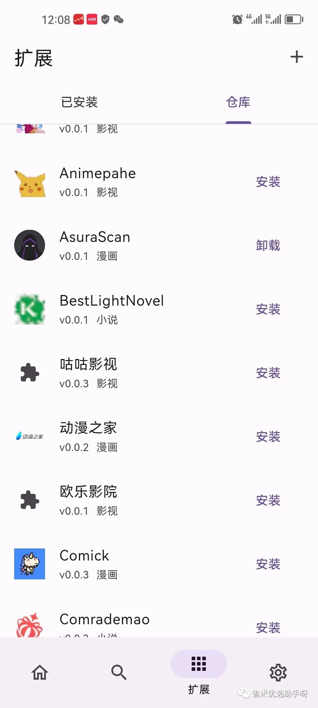 里面自助安装插件,里面提供了非常多的插件库,很贴心有分出影视,漫画,小说三种类型。