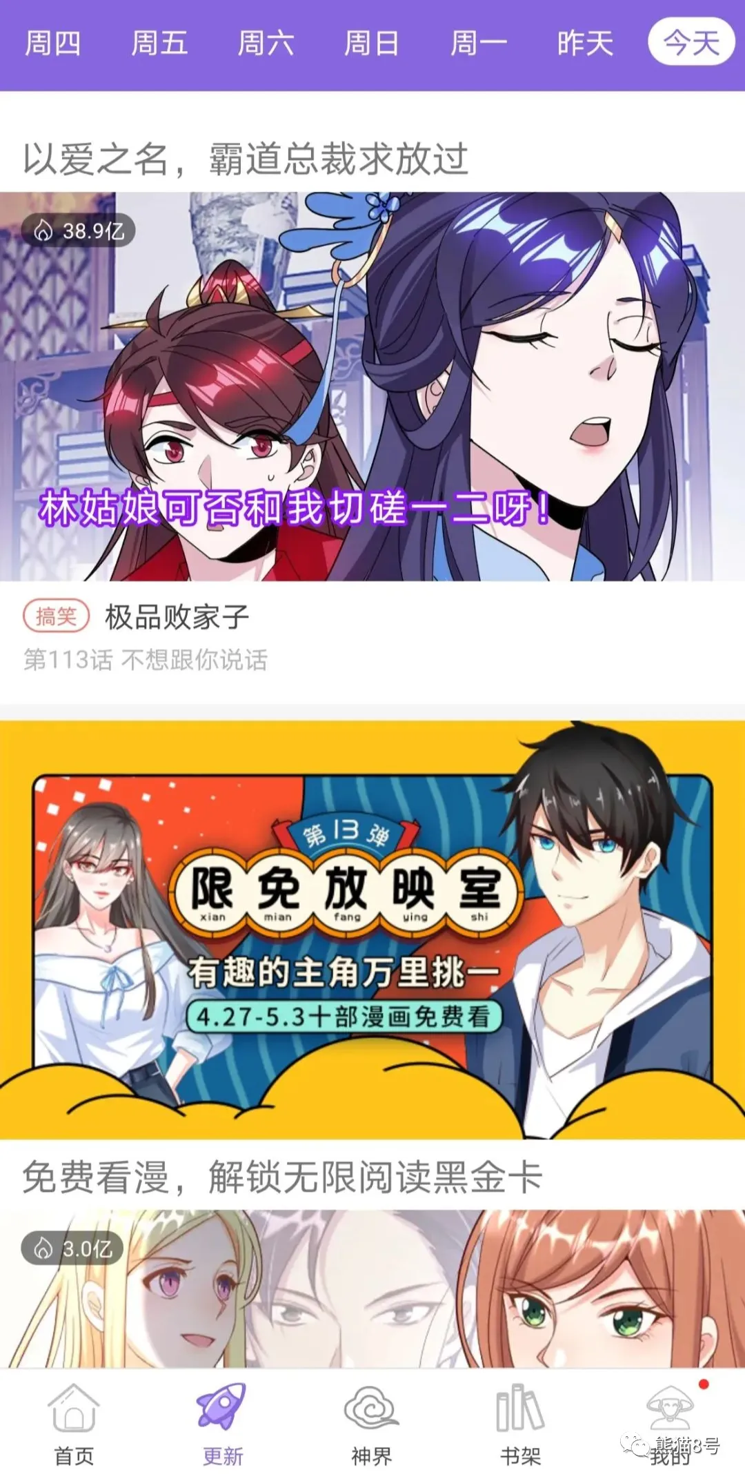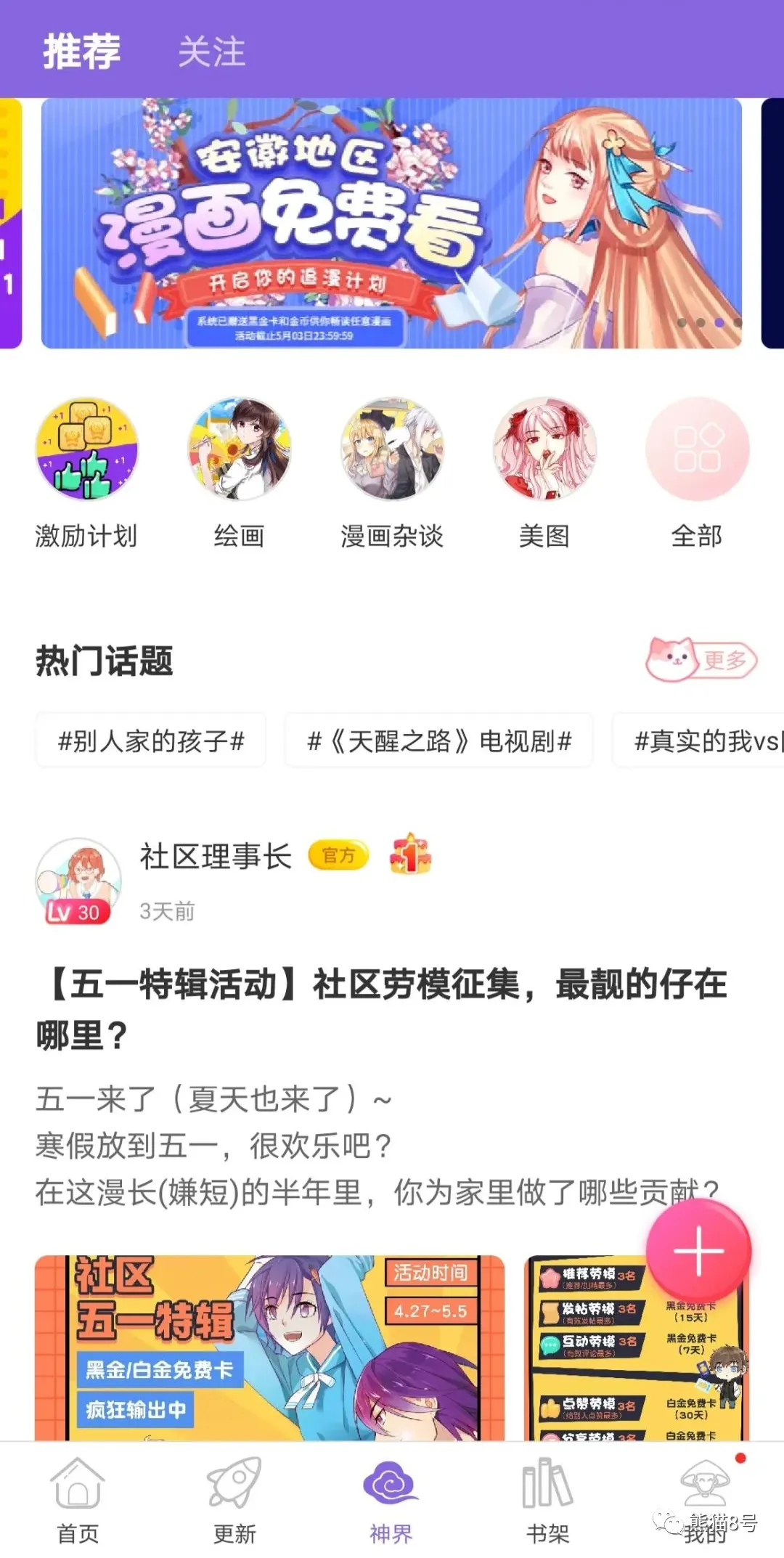 滴滴滴~~老司机来了,追漫神器 说 明 1.本公众号致力于每天分享一些手机、电脑端的黑科技软件,全部资源均为免费,仅供交流、学习和自己使用,如有侵权,请及时联系熊猫删除。 2.如果您喜欢本公众号的话,请置顶消息,或者设为星标,不错过熊猫的每条信息,方便您的查阅。 3.很多小伙伴们不知道怎么食用每日福利,所以熊猫在此提醒各位一定要仔细阅读每天公众号的两篇文章!对直接伸手党请不要怪我无视! 由于公众号的特殊性,为了防止走丢,熊猫建了一个群,方便大家交流学习。公众号里定期删除的资源可在群里寻找,也可在群里提出自己的需求。 长按下发二维码,加熊猫微信,备注“加群”,拉你进群,如果没有第一时间拉,请耐心等待。 花一秒钟支持下熊猫哦~打完卡即可退出,无需等待 昨天熊猫给大家分享了三款音乐软件,分别支持PC、iOS和Android:音乐专题(点我直达),这三款软件全部免费,功能齐全,不同客户端的软件特点各不相同,特别是iOS的TunePro Music,直接上架了App Store,真的很难得。喜欢音乐的小伙伴们不要错过了~ 随着社会的发展,越来越多的小伙伴开始喜欢漫画了,可是优秀的漫画软件少之又少。很多漫画软件基本上只包含自己旗下的漫画,如果同时喜欢多个漫画,就得下N个漫画软件,而且很多漫画都是收费的,费用还不低。这让很多小伙伴望而却步,不过不用着急,今天熊猫就给大家带来一款漫画软件,支持Android和网页端。 神 漫 画 支持平台:Android、网页 花一秒钟支持下熊猫哦~打完卡即可退出,无需等待 下载安装好软件,打开之后,可以看到,软件里面漫画种类繁多,拥有众多资源类型分类,你喜欢的漫画都能从这里找到并可以下载。软件也会根据个人喜好进行分析,更加精准的进行分类推荐,真是软件如其名,神一般的存在。首次进入软件还有喜好选择,方面以后推荐类似作品,非常的人性化。 【更新】菜单中,可以轻松查看到一周内的资源更新情况,并且在漫画封面的左上方还会显示当前的热度。 【神界】菜单,这里仿佛是一个新大陆,让你进入了一个新世界,它犹如一个小贴吧,每个用户都可以自由的发帖,用户之间也可以相互交流。同时,【神界】中还拥有不同的圈子,轻松帮你再一次缩小兴趣定位。 漫画阅读方面,找到你想阅读的漫画后,即可直接进入阅读,阅读界面的DIY设置也是非常人性化。唯一不足的是章节之间可能有一点点小广告,不过无伤大雅,影响不大。 总的来说,这是一款不可多得的追漫画神器,完全免费,少量广告,资源丰富,社交方便。支持网页端,iOS用户可以在网页上直接浏览,也是非常的良心的。 往日精品推荐: 三款音乐神器:音乐专题 茶杯狐:强大的影视资源聚合搜索网站 小男孩去水印:完全免费,万能短视频去水印 影视搜搜:PC观影软件,不止能搜妇联4,也能搜那种资源 比优视频:海量资源,在线观看,专注国外影视剧 长按识别二维码 后台回复关键字:漫画