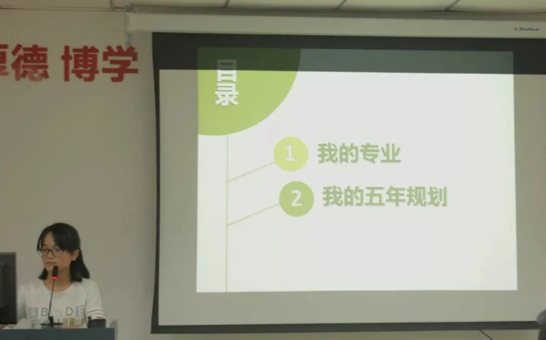 在PPT展示环节,五位选手临场不怯,讲评流利,制作的PPT虽风格不一,但各有新意。其中,来自会计152班的彭晓可所制作的PPT中小猪佩奇的元素贯穿始终,加以活泼的《Schnappi》的背景音乐,有趣生动地展示了会计的专业优势和劣势等内容。