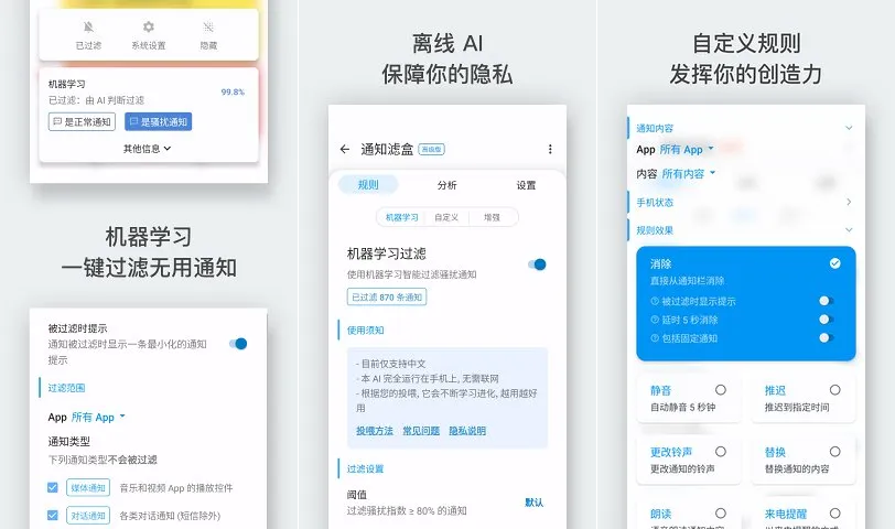 此外,通知滤盒还允许用户设置通知的优先级,以确保高优先级的应用通知不会被过滤掉。用户还可以随时查看已过滤的通知,并选择删除或恢复。总的来说,通知滤盒有助于提高工作效率,净化通知环境,避免信息过载和分心。