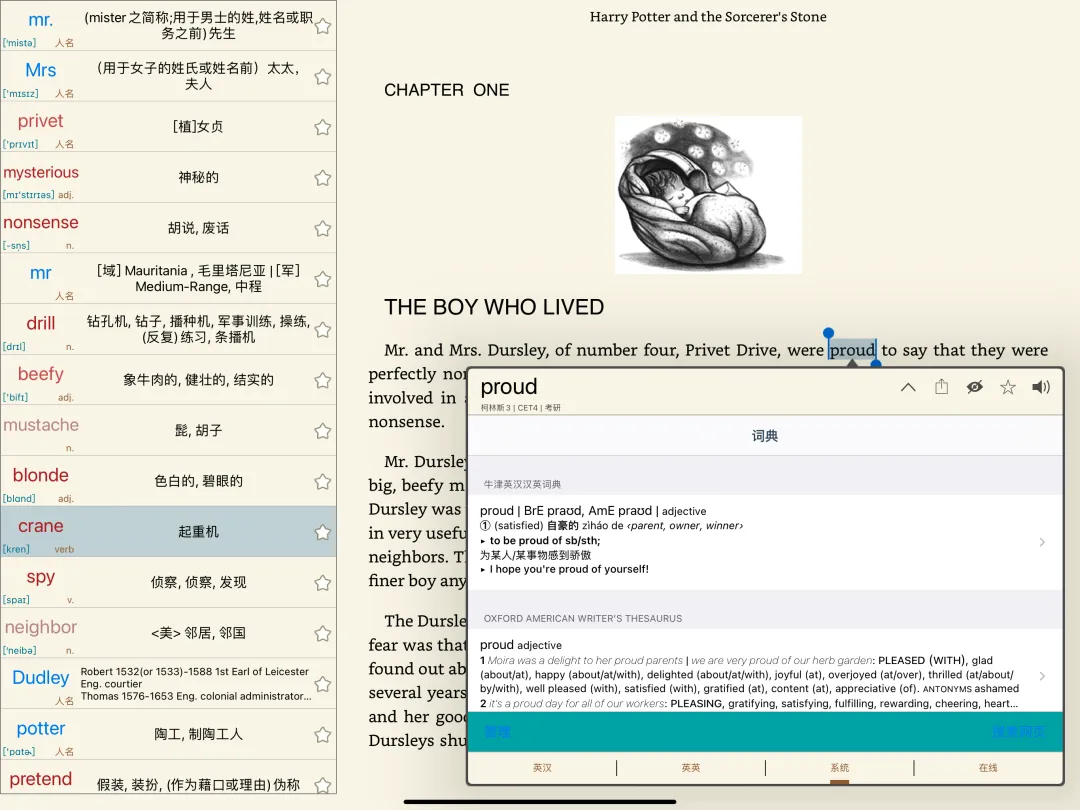 如果你觉得这些词不全,还是有些单词不认识。别担心,只需要长按你要查找的单词,就会弹出非常详细的翻译框。你还可以选择英汉、英英、在线翻译等多种词典,只有你看不到,没有你查不到。