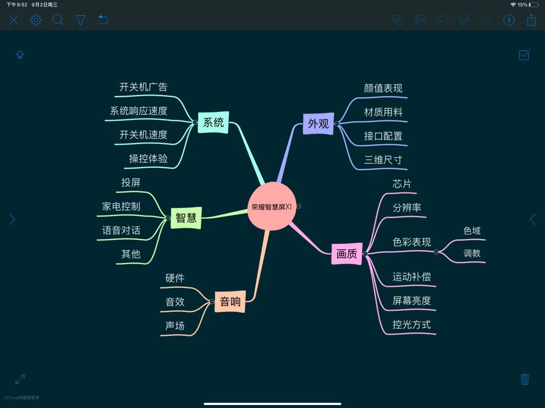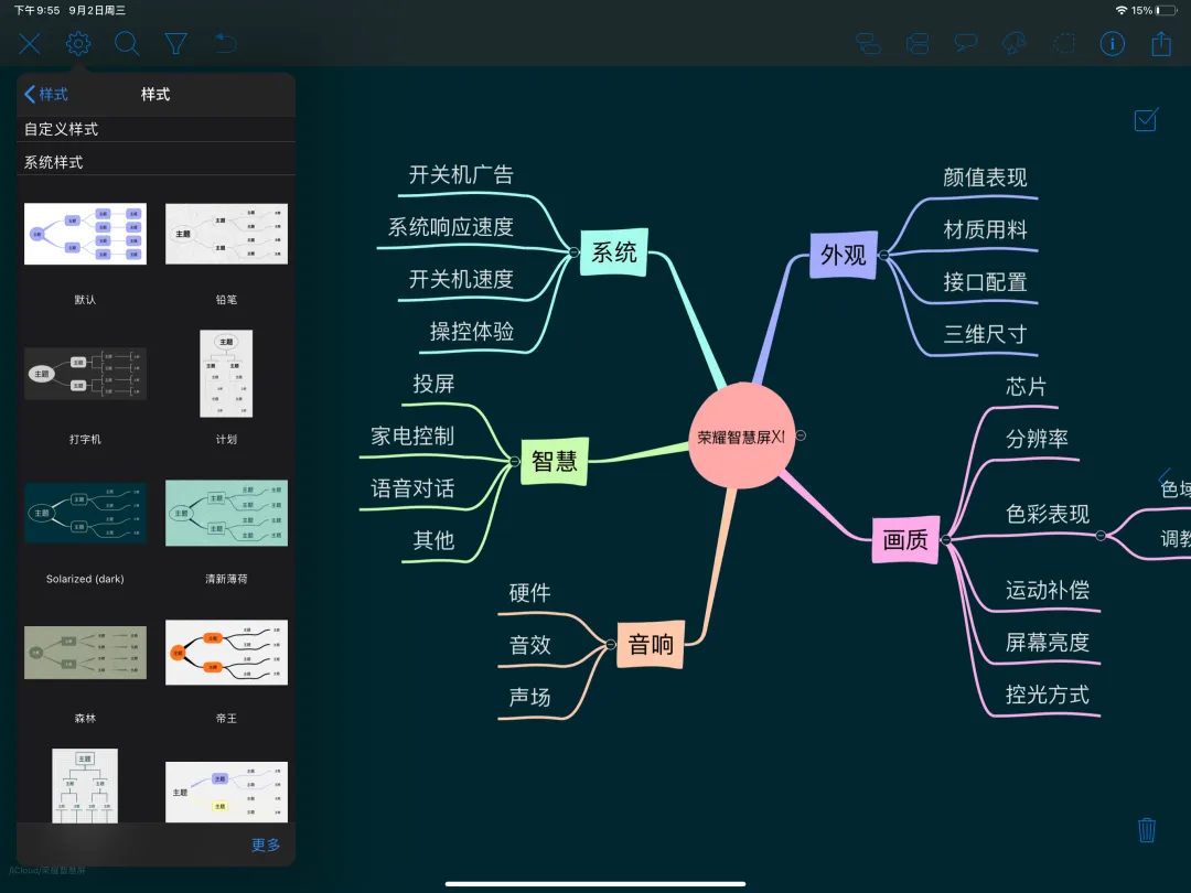 主题风格上,有我最喜欢的手绘风格,与iPad外接蓝牙键盘兼容性也非常好。Tab键用来新建子标题,Enter键用来新建兄弟标题,而DEL则用来删除当前标题。另外你还可以任意拖拽某一个元素进行排版,让整个思维导图看上去比较匀称好看。